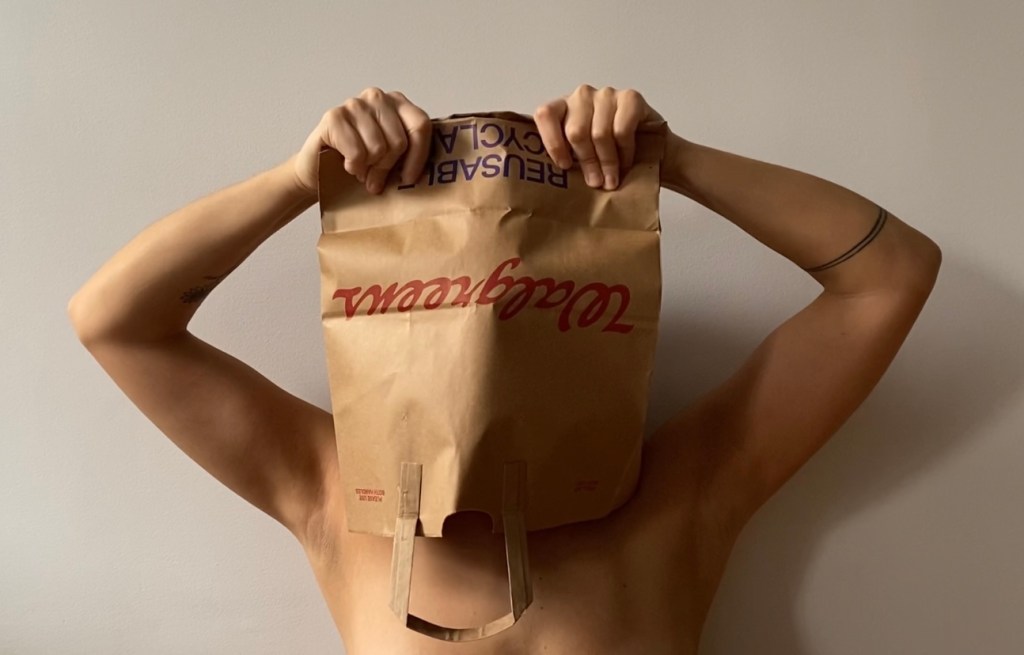 video documentation, 09:18 min., 1920 × 1080p., paper bag and human body.