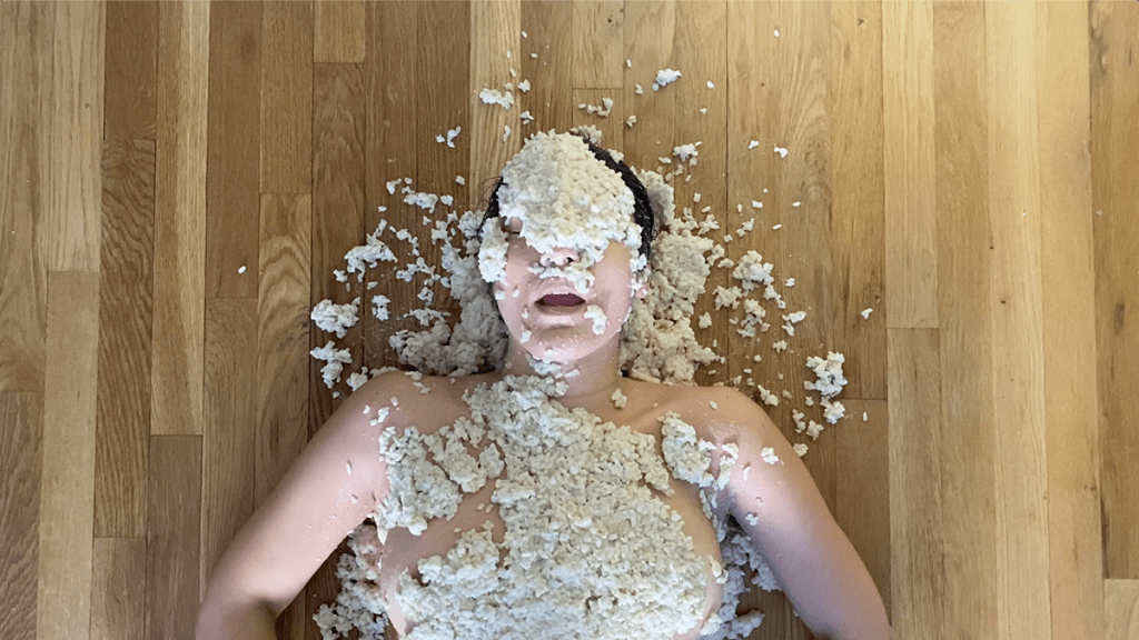 documentación en video, 12:08 min., 1920 × 1080p., arroz integral sobre cuerpo humano.