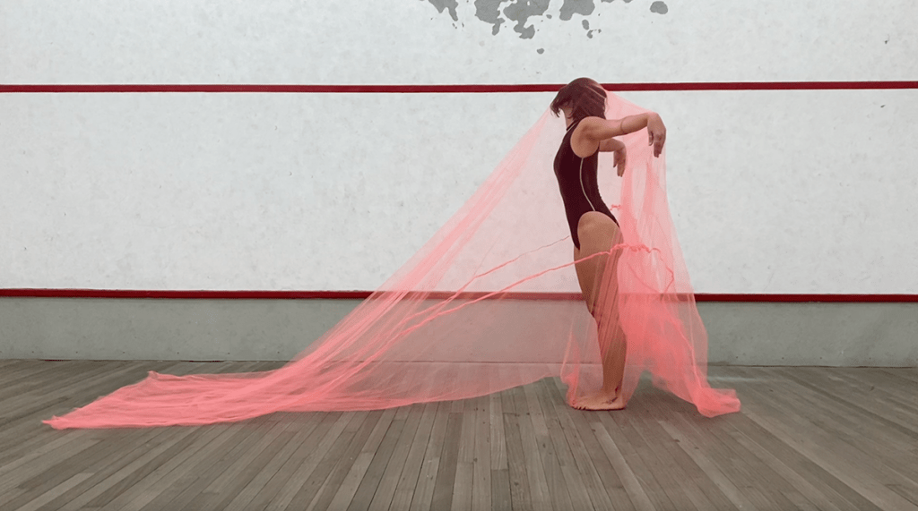 video documentation (5), 01:27, 01:47, 01:48, 01:32, 01:57 min., 1920 × 1080p., pink tulle and human body in swimsuit.