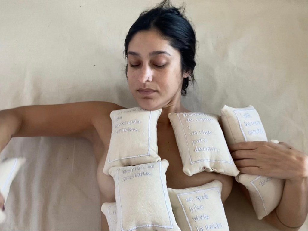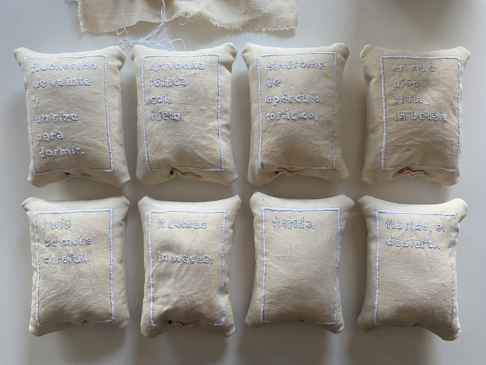 canvas, cotton thread, and rice, (8) 8 x 6 x 3 in / 20 x 15 x 7 cm